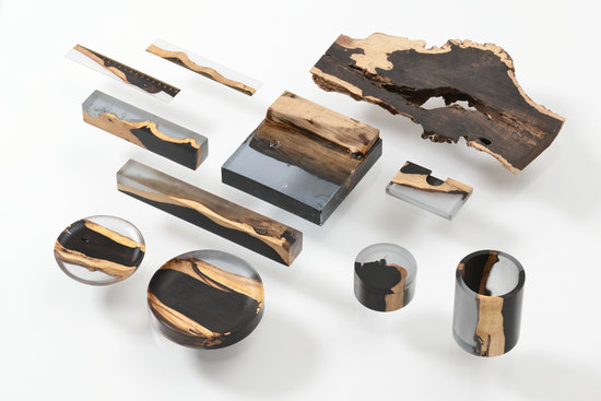 通過研究樹脂配方,環(huán)境溫度等各項(xiàng)參數(shù),在樹脂上加入顏色,剛好填補(bǔ)了本不規(guī)則的木頭表面或腐朽的部分,使之成為一塊塊規(guī)整的材料,并可以進(jìn)行二次創(chuàng)作,實(shí)現(xiàn)小批量量產(chǎn)。