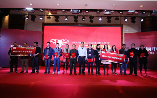 圖為李榮坤董事長(zhǎng)(左3)為櫻雪四川區(qū)域2016年度金牌經(jīng)銷商頒獎(jiǎng)