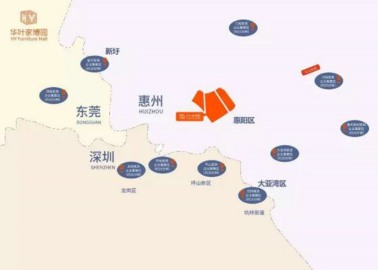 如廣東深惠區(qū)域的家具企業(yè)雖然只有3000多家,但年產值卻高達2000多個億,是龍江區(qū)域的十倍,如此巨大的產業(yè)規(guī)模,使得華葉家博園的落成,成為當?shù)禺a業(yè)優(yōu)化的關鍵。華葉家博園距離深圳龍崗、坑梓、坪山、坪地、寶安、東莞沙田、清溪、惠州三和、新圩、大亞灣等家具產業(yè)集聚區(qū)最遠45分鐘、最短15分鐘車程,對周邊家具產業(yè)的輻射與集聚效應顯著。