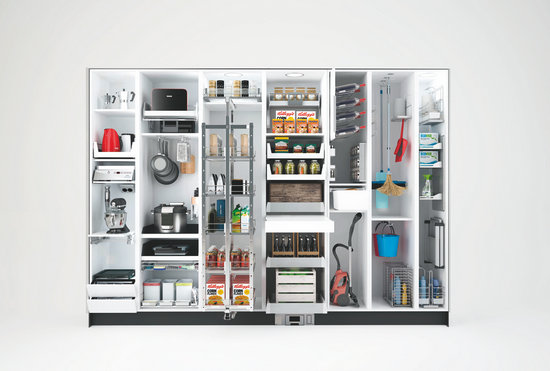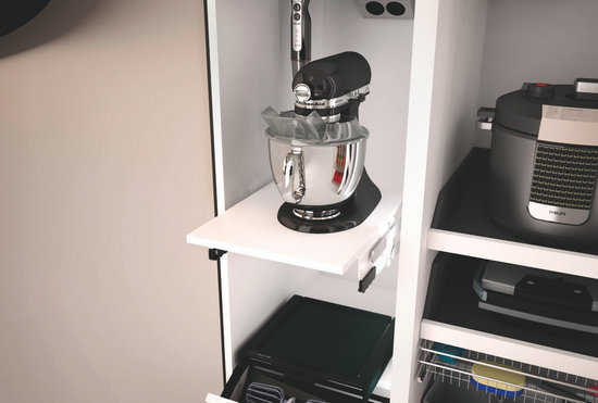 無論是三餐還是一頓盛宴,都需要多方的廚房用品合力協(xié)作。由此,海福樂充分利用廚房的縱向、轉(zhuǎn)角和內(nèi)部更深的空間,設計了立柜和吊柜、轉(zhuǎn)角拉籃、凹型抽屜拉籃以及可伸縮的拉籃,以增強儲藏能力。可一鍵掌控的廚用電動升降五金、移動烤箱或微波爐等,則讓整個空間更加自動、簡潔。