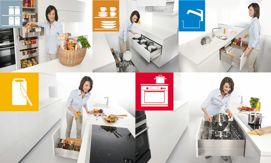 烹飪用具永遠放在爐灶的下方,利用 ORGA-LINE 內(nèi)分隔件進行收納,縮短行走的空間;可移動的調(diào)料架,為各種各樣的調(diào)料找到安身之地,可移動功能五金讓使用更輕松;對柜體高度和寬度、深度的靈活設(shè)計,自由增減收納空間;SPACE CORNER 轉(zhuǎn)角柜體,不放浪費任何一點死角空間;SPACE TOWER 高柜內(nèi)抽,備用食品的家……