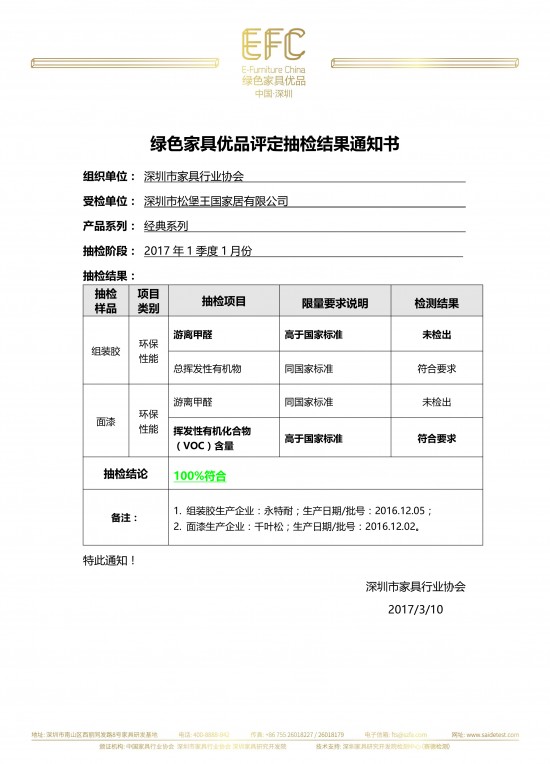 3月10日,深圳市家具行業(yè)協(xié)會(huì)檢測(cè)中心(賽德檢測(cè))針對(duì)松堡王國一季度1月份的抽檢工作圓滿結(jié)束,松堡王國再次以兩項(xiàng)“未檢出”、兩項(xiàng)“符合要求”的100%合格率完美通關(guān)。