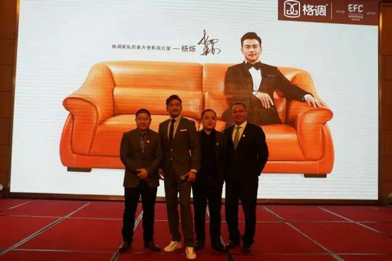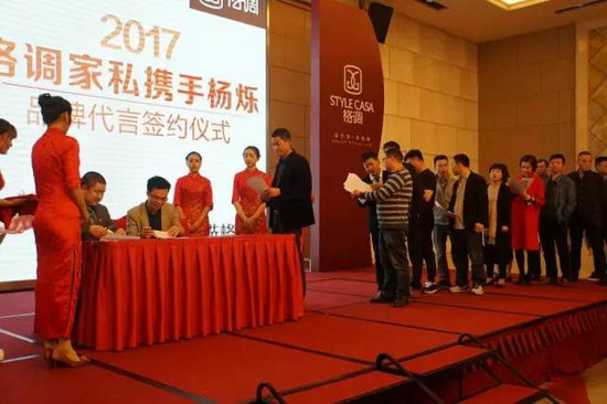 在愉快的氣氛中,格調(diào)家私董事長(zhǎng)總經(jīng)理李建煌先生、格調(diào)家私營銷中心副總經(jīng)理張杰先生、武漢格調(diào)經(jīng)銷商周錦輝先生上臺(tái)與楊爍先生一起,共同啟動(dòng)簽約儀式,屏幕絢麗的燈光特效隨即引出楊爍先生為格調(diào)拍攝的海報(bào),至此簽約儀式正式完成。