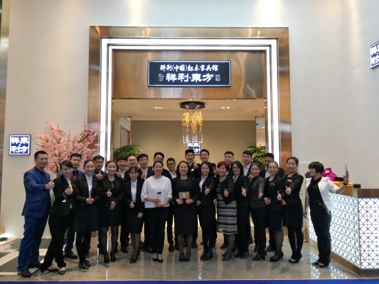 祥利紅木深圳展團隊手持金獎在展廳前合影