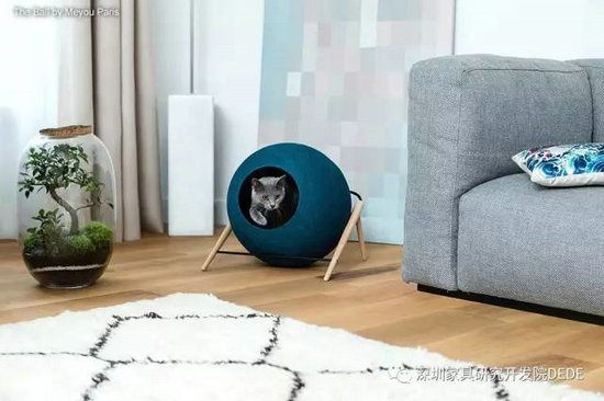 上圖的立方體成了完美的避難所,我們毛茸茸的朋友蜷縮在里面,感到很安全。這個(gè)產(chǎn)品呈現(xiàn)出完美的形式感和平衡感:一個(gè)軟織物安置在金屬框架里。球在MEYOU的這個(gè)系列里是一個(gè)重復(fù)出現(xiàn)的造型,使用了木材則更加天然,且充分考慮到避免刮傷的范圍。貓咪的床和主人的床高度一致,可以放在他們主人的床旁邊,它們可以毫不費(fèi)力地爬過來陪主人睡覺了。