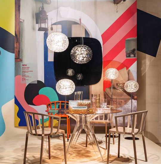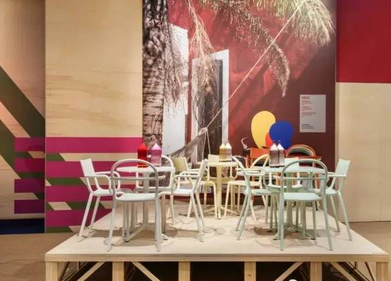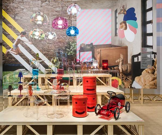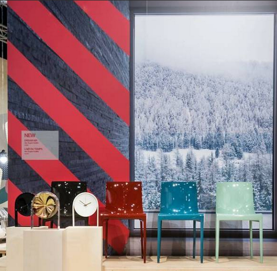 ▲ Kartell展廳利用照片與視覺符號相結(jié)合的平面背景,給前面的產(chǎn)品營造了語境,增強理解與感受。