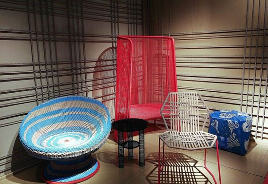 ▲ Moroso運用線性隔斷突出了戶外產(chǎn)品的編織屬性。作品包括上世紀(jì)60年代復(fù)古皮、V&A椅子,三宅一生的餐桌以及佐藤大的高速公路餐桌等。