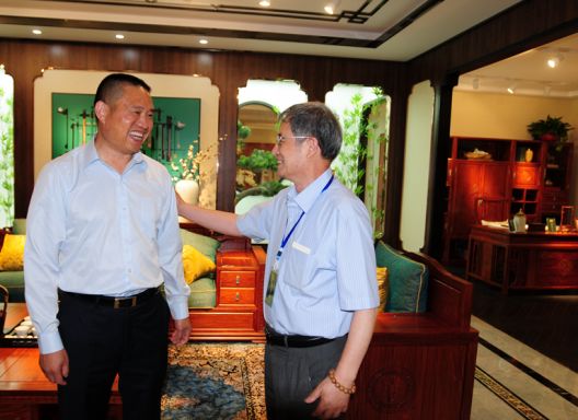 紫翔龍董事長姜玉忠與中國高級工藝美術(shù)師韓國榮在紫翔龍展廳對紅木家具之美進行愉快密切的交流探討。