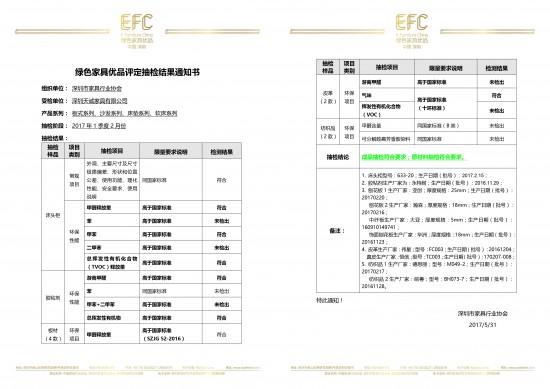 5月31日,天誠家具一季度2月份抽檢工作宣告結束,天誠家具以“成品抽檢符合要求;原材料抽檢符合要求”的完美成績,捍衛(wèi)企業(yè)的品牌榮譽。