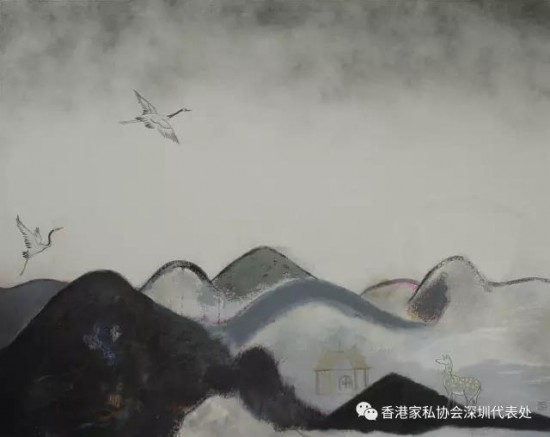 藝術家黃啟佑的作品運用山、水、鶴等東方的元素,營造一種寧靜與仙氣。表現(xiàn)了在當下嘈雜喧鬧的社會,藝術家尋求內(nèi)心的一片凈土。這些藝術家對生活有著不同的理解與感悟,并將感悟表現(xiàn)于創(chuàng)作當中。