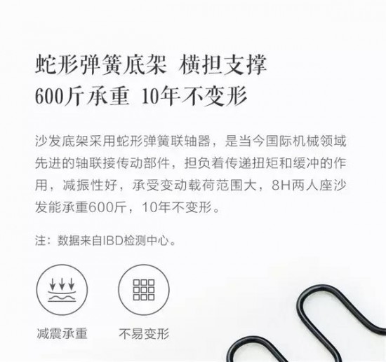 小米官方宣稱,8H獨立袋裝彈簧布藝沙發(fā)采用Thomasville(美國白宮沙發(fā)供應商)萬元級配置,這應該就是所謂“白宮級級別坐感”來源。布料采用色織工藝,線染后織,水洗不易褪色。兼具防水防污性能,液體撒落后形成水珠并滑落,即使有少量污物附著,用紙巾即可輕松擦除。沙發(fā)內(nèi)部采用超行業(yè)標準的35kg/㎡高密度回彈海綿作為坐墊填充物,每個坐墊均配有49個精鋼獨立袋裝彈簧作為內(nèi)部支撐,可承受8萬次沖擊不變形。此配置以往只用于萬元級沙發(fā)。沙發(fā)底架采用蛇形彈簧連軸器,兩人座沙發(fā)能承重600斤,號稱10年不變形。沙發(fā)框架采用生長于海拔2000米的俄羅斯落葉松,硬度強,板材達到CARB P2級美標,環(huán)保健康。