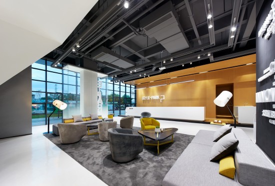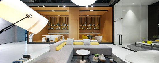 淡洽區(qū)以簡約的明黃色為主調,沙發(fā)則走高級灰路線,項目名稱醒目地打在明黃色的墻上,logo的筆觸設計強勁而有力。