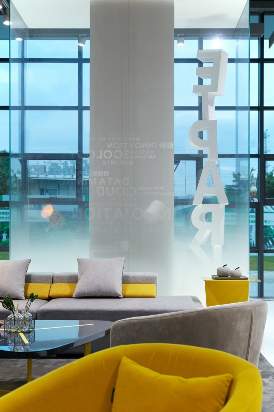 落地玻璃也室外景色無縫連接,細看玻璃上還有英文字母的水印,E-PARK的字母組合成柱狀,不統(tǒng)一的朝向展現(xiàn)自由意味。