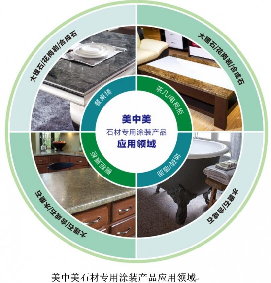 美中美石材專用涂裝產品主要用于天然花崗巖、大理石、片材合成石、景觀水磨石等家具、建筑裝飾材料涂裝施工,該系列產品正式投放市場以來,品質優(yōu)異、性能卓越,獲得眾多行業(yè)標桿客戶一致好評。