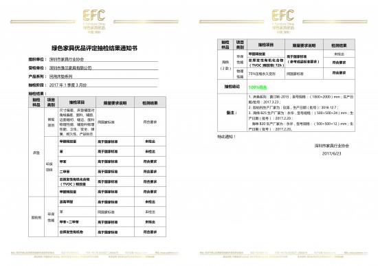 6月23日,雅蘭床墊“中國綠色家具優(yōu)品”一季度3月份的抽檢工作完成,所抽檢的床墊成品及膠粘劑、海綿原材料均達到中國綠色家具優(yōu)品各項限量要求,抽檢合格率100%。