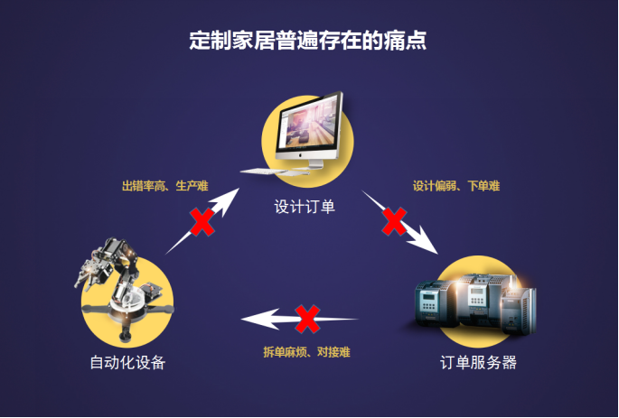 自動化技術(shù)驅(qū)動著家居行業(yè)的發(fā)展,但出錯率高、對接難、成本高等問題依然無法根治。門店下單難,人工制作的下單文件錯漏百出,下單到工廠,因不同的家具樣式對板材的工藝要求也不一樣,工廠人工拆單同樣錯漏百出,加上軟件與設(shè)備對接困難,對接成本高,客戶想要的家具根本無法生產(chǎn)。