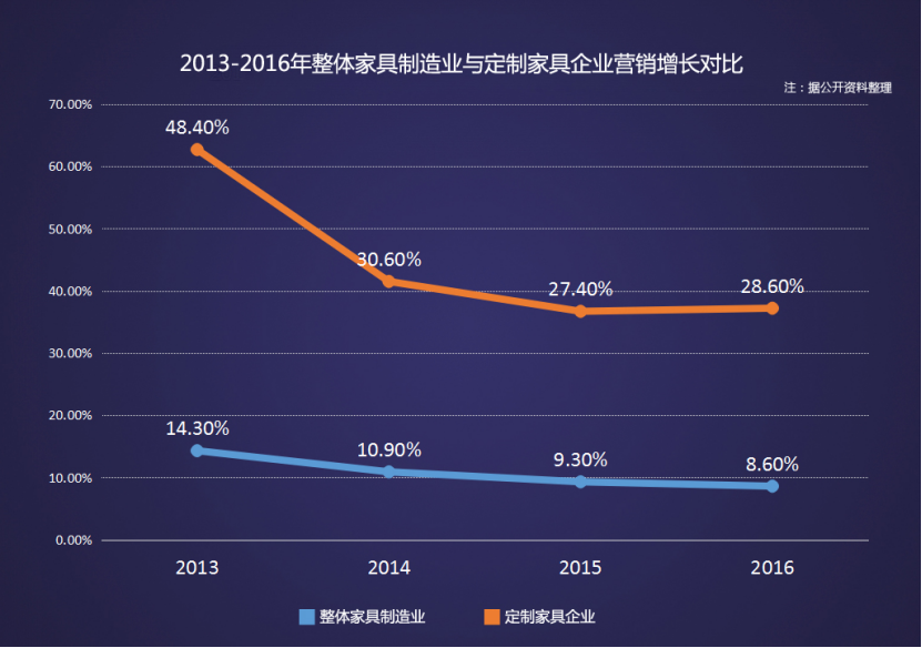 2017年,定制家居企業(yè)迎來密集IPO上市潮,“定制熱”“上市熱”更是一躍成為家居行業(yè)輿論之巔,定制家居作為最能迎合新一代消費者需求的家具產(chǎn)品,具備巨大發(fā)展空間,定制家具品牌營收增幅相對明顯,其增長速度遠超家具制造業(yè)整體增長水平。