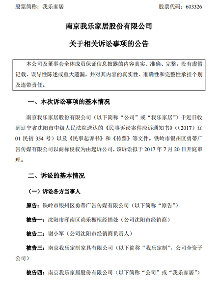 2017年6月13日晚間,我樂家居發(fā)布公告稱,公司于近日收到遼寧省沈陽市中級人民法院送達(dá)的《民事訴訟案件應(yīng)訴通知書》((2017)遼 01 民初 354 號)以及《民事起訴書》和《傳票》等文件。鐵嶺市銀州區(qū)勇蒂廣告?zhèn)髅接邢薰疽陨虡?biāo)侵權(quán)為由起訴公司,該訴訟擬于 2017 年 7 月 20 日開庭審理。
