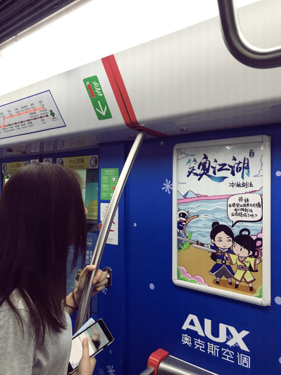 然而,有小伙伴還發(fā)現(xiàn)在地鐵的車廂底部也是奧克斯空調(diào)精心繪制的“笑奧江湖”漫畫,以詼諧的手法將笑傲江湖里的人物與奧克斯空調(diào)的品牌形象、產(chǎn)品調(diào)性相結(jié)合,傳遞出年輕化、時尚化的品牌理念。