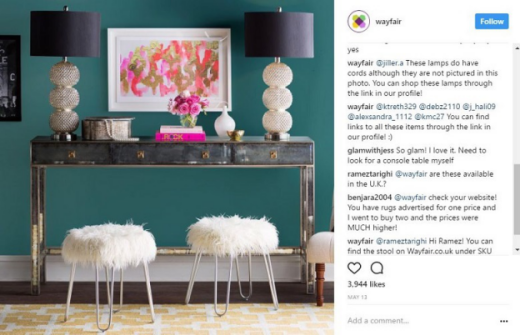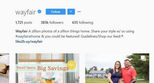 Instagram在用戶中培養(yǎng)“社交控”,而許多品牌則利用漂亮的圖片來激發(fā)人們購買產(chǎn)品的欲望。Wayfair也這樣做,它還采取措施來確保其品牌易于理解和接近。