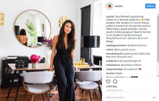Wayfair也經(jīng)常與電視節(jié)目的人物合作,例如《單身女郎》和《美少女的謊言》,吸引這些節(jié)目的女性觀眾。一張關(guān)于女主角Shay Mitchell的帖子是去年人氣最高的帖子之一,這表明知名人士能創(chuàng)造更高的用戶參與度。