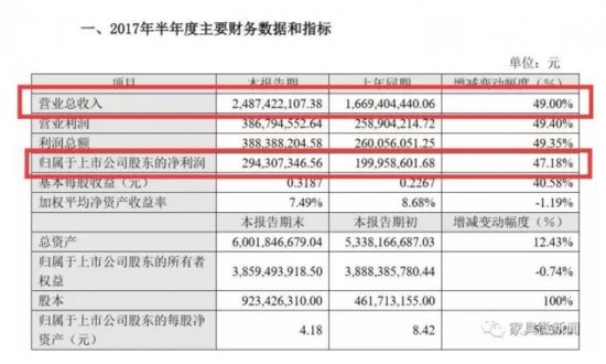 7月14日晚,索菲亞公司公布2017年上半年度財(cái)報(bào),財(cái)報(bào)顯示,公司2017年半年度實(shí)現(xiàn)營(yíng)業(yè)總收入248,742.21萬(wàn)元,比上年同期增長(zhǎng)49.00%;利潤(rùn)總額38,838.82萬(wàn)元,比上年同期增長(zhǎng)49.35%;實(shí)現(xiàn)歸屬于上市公司股東的凈利潤(rùn)29,430.73萬(wàn)元,比上年同期增長(zhǎng)47.18%。