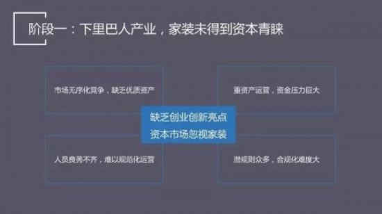 家裝市場三個(gè)階段:在2012年以前,或者說行業(yè)內(nèi)相當(dāng)多主流的一部分人認(rèn)為裝修行業(yè),尤其是家裝領(lǐng)域是下里巴人的產(chǎn)業(yè),是屬于比較粗放型的發(fā)展模式。從資本市場看來,在那之前整個(gè)家裝上市公司是微乎其微的,只有東易日盛,其他都沒有上市,整個(gè)家裝行業(yè)是不被資本待見的。市場無序化競爭,缺乏優(yōu)質(zhì)資產(chǎn),潛規(guī)則眾多,合規(guī)化難度大。