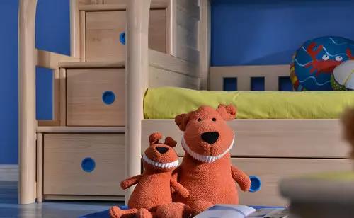 雙層床的樓梯從安全角度出發(fā),也設(shè)計(jì)為弧形狀,有效將力垂直向下分解,減輕梯子的受力。“樓道”彎曲的木材采用獲得專(zhuān)利的彎曲拼板工藝設(shè)計(jì),是從整根原木中直接取出來(lái)的,非常牢固、安全,而且彎曲弧線(xiàn)制作成大象鼻子的造型,增添童趣。階梯上的抽面板運(yùn)用了隱形拉手,踏步板上附有防滑墊,有效避免孩子們摔倒或磕傷。