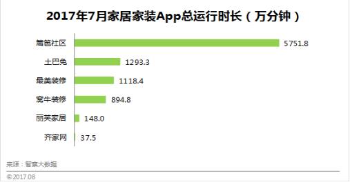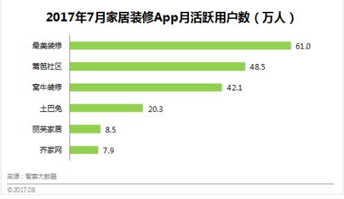 據(jù)智察大數(shù)據(jù)監(jiān)測顯示,在2017年7月家居家裝App月活躍用戶數(shù)上,最美裝修以61.0萬人排在第一位;籬笆社區(qū)排名第二,為48.5萬人;窩牛裝修排列第三,為42.1萬人;土巴兔位居第四,為20.3萬人;麗芙家居排行第五,為8.5萬人;齊家網(wǎng)排在第六位,為7.9萬人。