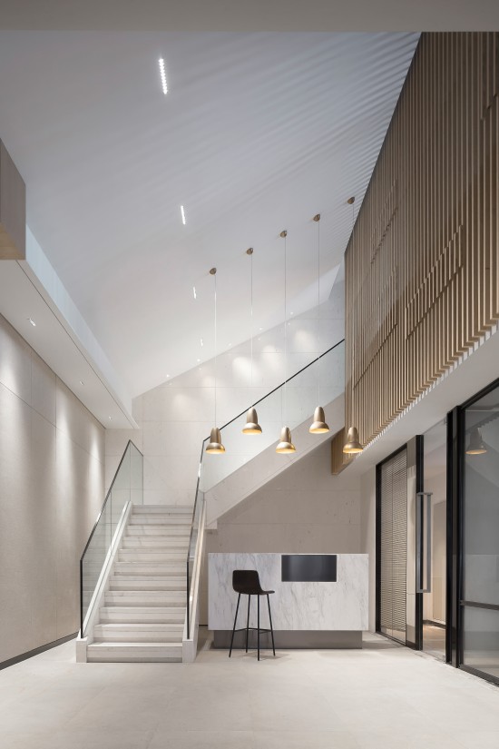 The overall space manages to offer more relaxing and quiet and less flashy. It emphasizes the use of pure materials to reflect the taste and neat lines to broaden horizon, and banishes any complex decorative element. Dominant tone of pure white and plain wood bring about fresh and nature feelings. The combination of sunlight and transparent materials relieves the stress during work and creates an atmosphere of elegance.
