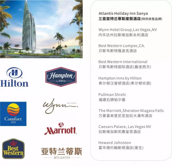 其實,60年來,美力格與全球五星級高端酒店的合作早已淵源深厚。多年來,美力格以超五星級的床墊品質(zhì)水準,一直源源不斷的為全世界的酒店業(yè)提供卓越舒適的睡眠體驗,更成為三亞亞特蘭蒂斯度度假酒店、拉斯維加斯永利酒店、希爾頓漢普頓酒店、福建石獅鉑爾曼、萬豪喜來登等五星級高端酒店的獨家床墊供應(yīng)商,譽滿全球。美力格相信,每個人都值得擁有一張好床墊,唯有好睡眠才是無可取代。