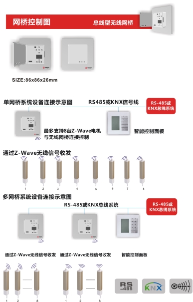 RS-485/KNX轉Z-Wave無線網橋,可同時控制8個Z-Wave協(xié)議窗簾電機;網橋連接的8臺電機可獨立設置ID地址,具備獨立控制、群控功能。外接RS485/KNX總線系統(tǒng),可對電機分組、群控、場景控制,實現(xiàn)智能控制功能。網橋功耗低、抗干擾能力強,可吸頂安裝、墻控8盒安裝,操作靈活簡易。