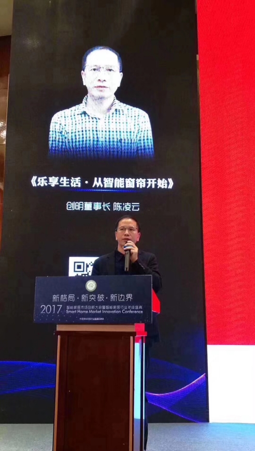 智能化元素的融入將讓軟裝更具體驗感,更富科技感,從而為我們帶來舒適便捷的家居生活體驗。廣東創(chuàng)明遮陽科技有限公司董事長——陳凌云先生作為此次智能家居創(chuàng)新大會的主講嘉賓,發(fā)表了《樂享生活?從智能窗簾開始》的主題演講。