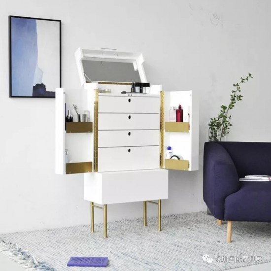 這款作品的靈感來源于生活中女性化妝的困擾。常型梳妝類家具的臺面進深較大,人容易看不清面部細節(jié)。加上生活節(jié)奏快,站著化妝的人占比例比坐著化妝的人更高。這款作品根據(jù)常見護膚品和彩妝的體積,女性化妝的順序設(shè)計。在收納上,容量大,基本容納大多數(shù)女性的護膚品。它的動線流暢,功能性突出。