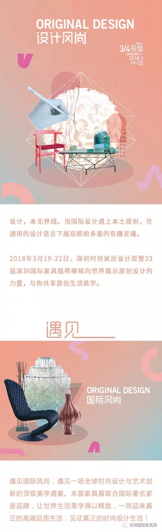 這是一次國際設(shè)計與中國制造對接的機遇,這是一場全球時尚設(shè)計與藝術(shù)創(chuàng)新的頂級美學盛宴。2018年3月19-22日,深圳時尚家居設(shè)計周暨深圳國際家具展邀您一同見證中西無界的生活方式、感受家居設(shè)計的原創(chuàng)力量,體驗全球無與倫比的設(shè)計暢享!