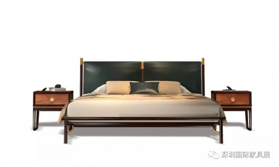 床型取方形結(jié)構(gòu),有初始之意,初始根本為‘元’,造型雖用線條取方形框架結(jié)構(gòu),但框架由圓柱形構(gòu)成,靠背及扶手突出的位置均為圓形面,圓即為點的集合,乃萬物運動的本質(zhì),亦為乾坤之道,配以金屬裝飾,更是以小見大,突顯床體的高雅肅穆。