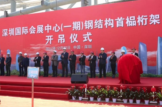 出席此次吊裝儀式的領導有深圳市政府副秘書長、國際會展中心建設指揮部常務副總指揮劉志達,深圳市招華國際會展發(fā)展有限公司總經理馬軍,副總經理李年長,深圳市歐博工程設計顧問有限公司總經理林建軍,中建鋼構有限公司黨委書記、董事長王宏,深圳國際會展中心(一期)施工總承包工程項目總經理史如明等。