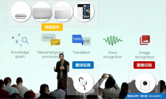 2016年,谷歌CEO桑達(dá)爾·皮查伊在谷歌大會(huì)提到了自家的AI技術(shù),有知識(shí)圖譜、自然語音處理、翻譯、語音識(shí)別、圖像識(shí)別這六點(diǎn)。這六點(diǎn)具體在科技產(chǎn)品上的體現(xiàn),可以劃分為語音助手、機(jī)器翻譯和圖像視覺。