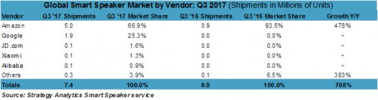 亞馬遜Echo在14年11月對(duì)外公布,在15年6月開始公開售賣,當(dāng)年銷量約250萬臺(tái)。谷歌在2016年11月推出了Google Home智能音箱。從那開始,美國(guó)的智能音箱市場(chǎng),一直是亞馬遜和谷歌的二元爭(zhēng)霸。關(guān)于兩者的競(jìng)爭(zhēng)格局,17年12月騰訊新聞?dòng)衅獔?bào)道說『亞馬遜銷量遙遙領(lǐng)先,幾乎是第二名Google Home的三倍』。這么說不太準(zhǔn)確,容易讓人誤解。因?yàn)閬嗰R遜Echo一直都是領(lǐng)先,但是谷歌的份額卻是在慢慢增長(zhǎng)。亞馬遜的市場(chǎng)份額在2016年Q4季度是谷歌的8倍,在17年4月是谷歌的3倍,到17年Q3季度,大約是2.7倍。如下是strategy analytics 給出的2017年Q3季度智能音箱出貨量。國(guó)內(nèi)廠商小米、京東和阿里都有上榜。國(guó)內(nèi)因?yàn)槿丝诨鶖?shù)大,經(jīng)過17年年底的瘋狂促銷,Q4之后的國(guó)際格局很快要被中國(guó)廠商攪亂。