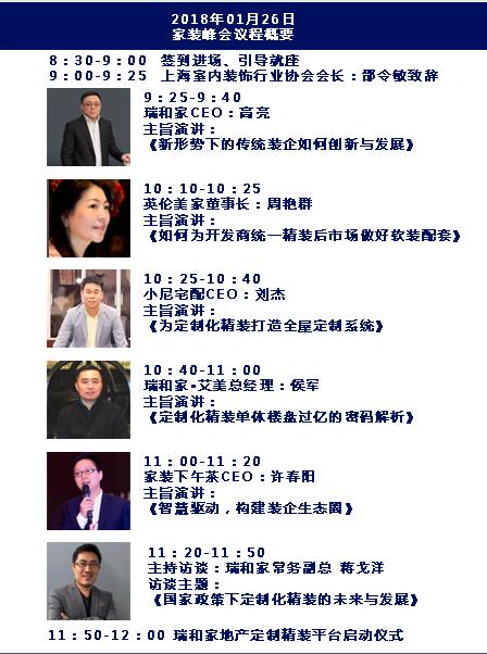 行業(yè)系統(tǒng)數(shù)據(jù)大盤點,分析18年裝飾行業(yè)大趨勢下的新機遇。會議分享內(nèi)容包括《新形勢下的傳統(tǒng)裝企如何創(chuàng)新與發(fā)展》、《全裝修政策下地產(chǎn)企業(yè)如何與定制化精裝接軌》、《如何為開發(fā)商統(tǒng)一精裝后市場做好軟裝配套》等。會議現(xiàn)場不僅有各領(lǐng)導精彩的主旨演講,還有以“國家政策下定制化精裝的未來與發(fā)展”為主題的高端討論會。學習先進理念,建立務(wù)實合作,打造行業(yè)首家“地產(chǎn)定制精裝生態(tài)圈”。