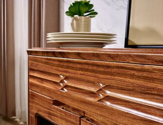 烏金木的木質比較硬、加工難度大,其切面光滑,細膩,打磨得當可達到鏡面光亮的效果。烏金木系列實木家具大氣貴族的顏色、奇異的“骨感美”和流暢的線條愈發(fā)顯出該系列精良的做工,細節(jié)之處感到天然的美感和自然氣息。