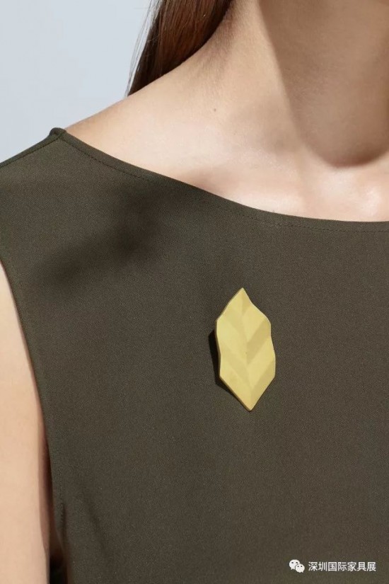 「FALL-胸針」是一個(gè)手工陶瓷首飾系列,五個(gè)顏色(霧白/草灰/谷黃/枯綠/楓紅)的靈感來自于北國(guó)的秋天,每一種顏色都在述說秋天的一個(gè)故事。FALL胸針系列提取、簡(jiǎn)化不同葉子的形態(tài)特征,讓形態(tài)變得幾何和抽象,通過對(duì)于折紙的研究,得到FALL的形態(tài),每一片葉子因?yàn)檎郫B變得立體,在光線下呈現(xiàn)出兩種顏色。