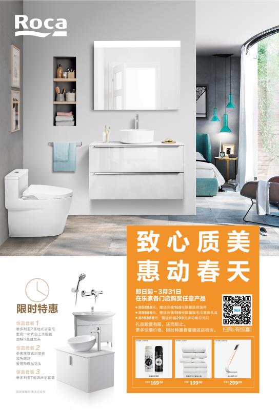 這個三月,Roca 樂家全國200家門店同步開啟“致心質(zhì)美,惠動春天”主題促銷活動,讓你用優(yōu)惠的價格把品質(zhì)好物整套帶回家?;顒悠陂g,凡在Roca樂家門店購買任意產(chǎn)品,購滿指定金額即有獨家好禮相贈。特惠套餐配上多重好禮,為你的浴室增添一抹春日生機!