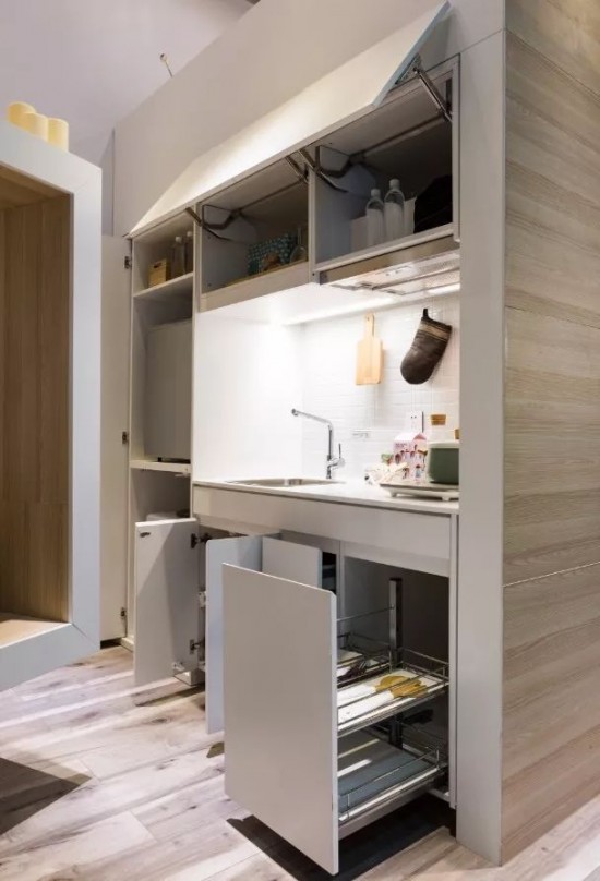 空間變身:從左到右分別為衛(wèi)生間、臥室、起居室。迷你廚房被安置在櫥柜中,被回旋推拉門隱藏。