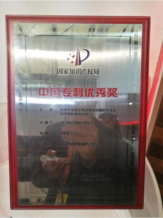 前不久,我們的“將實木地板應(yīng)用到地?zé)岘h(huán)境的方法及實木鋪裝結(jié)構(gòu)”這一專利獲得了國家知識產(chǎn)權(quán)局頒發(fā)的“中國優(yōu)秀專利獎”,與北京大學(xué)、中科院自動化所、三一重工、格力等知名高校、科研院所及知名創(chuàng)新企業(yè)一起,成為中國科研創(chuàng)新的榜樣,這也是對我們二十余載求索的認(rèn)可。