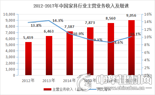 核心提示:2017年,家具行業(yè)整體發(fā)展趨于平穩(wěn)中略有回升。根據(jù)國家統(tǒng)計(jì)局的統(tǒng)計(jì),我國家具行業(yè)規(guī)模以上企業(yè)在2017年實(shí)現(xiàn)主營業(yè)務(wù)收入9056億