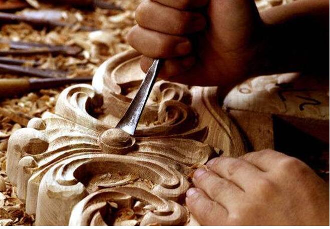 除了令人嘖嘖稱奇的榫卯工藝,雕刻工藝,也是紅木家具中最見真功夫的一道工序,它共要經(jīng)歷五個步驟,從“原坯拓樣”、“紋樣粗鑿”、“精工鏟雕”、“輪廓修飾”到“修磨處理”每一個步驟都需要極大的耐性,每一個動作都要謹(jǐn)小慎微,匠人們手上的力道一定要拿捏的恰到好處,否則一不小心就會給整個家具帶來不可逆的瑕疵。