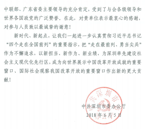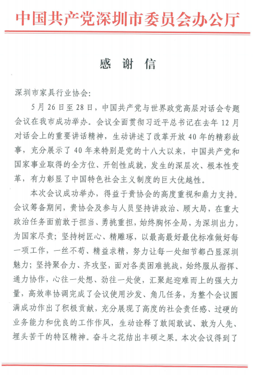 由中共中央對外聯(lián)絡(luò)部主辦的中國共產(chǎn)黨與世界政黨高層對話會專題會議于5月26號至28號在深圳成功舉辦,中共深圳市委辦公廳向深圳市家具行業(yè)協(xié)會發(fā)來感謝信。