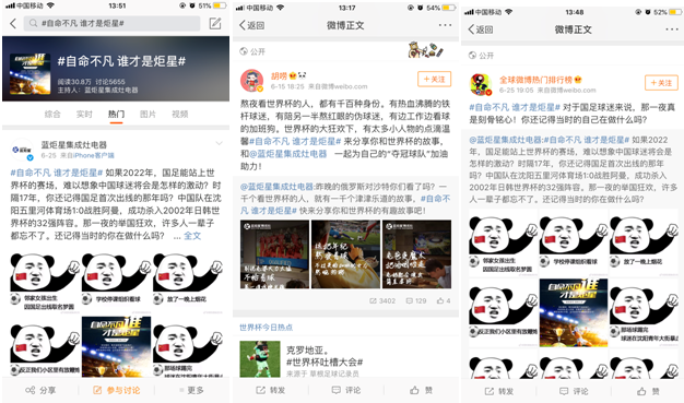 世界杯對于像藍(lán)炬星集成灶這樣做廚房電器的品牌來說,本是個(gè)不容易結(jié)合的營銷節(jié)點(diǎn),但是藍(lán)炬星集成灶準(zhǔn)確地洞察了世界杯看球人群的心理動(dòng)向和情感需求點(diǎn),很好地將兩者結(jié)合,并取得了不錯(cuò)的營銷效果。由藍(lán)炬星集成灶發(fā)起的微博話題“自命不凡 誰才是炬星”閱讀量超過30萬,討論量達(dá)到5600+,實(shí)際效果也相當(dāng)不錯(cuò)。