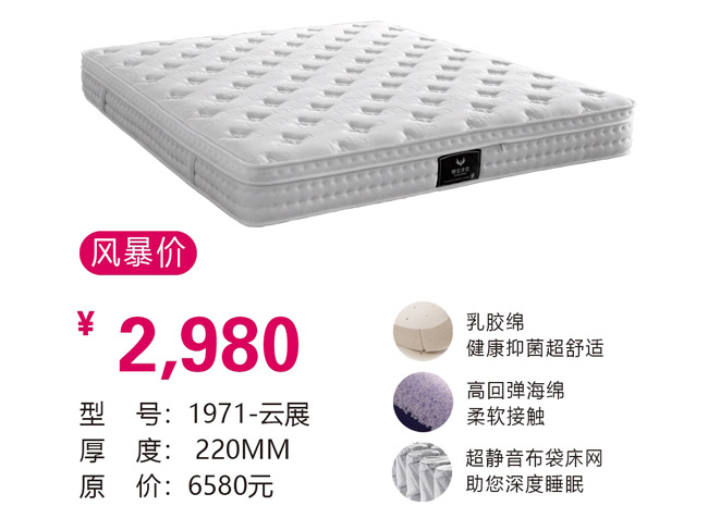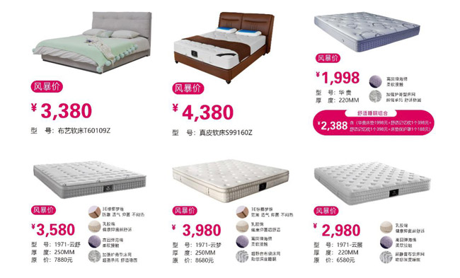 超強承托加強護(hù)脊床墊(1.8*2.0)風(fēng)暴價1998元,超靜音布袋簧床墊(1.8*2.0)2980元,高檔真皮軟床風(fēng)暴價4380元,時尚布藝軟床風(fēng)暴價3380元,除此之外,還有更多超值產(chǎn)品供您選購,具體活動詳情可咨詢當(dāng)?shù)厮雽毚矇|專賣店。